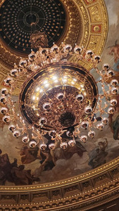 Beautifully painted ceilings, marble columns, and elegant staircases welcome visitors. Inside the concert hall, red velvet boxes reminded me of the Milan opera. However, the Hungarian house is smaller. What struck me was a beautiful chandelier (made in Germany, as a guide indicated). Some large opera boxes have historical significance.